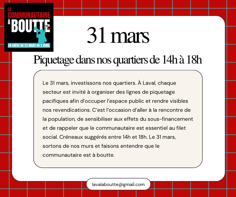Piquetage – Le mardi 31 mars de 14h à 18h, la Maison de Quartier de Fabreville sort de ses murs pour se faire entendre. C’est devant le 3031 boulevard Dagenais Ouest à Laval.